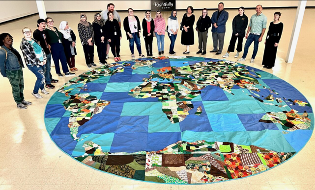 400 sq ft quilted globe map consisting of upcycled medical and other fabric. Photo taken with part of the team prior to presentation to the W.H.O. for display in the United Nations Building, Kennedy Center, Central Park, and then included in a traveling Covid Memorial.